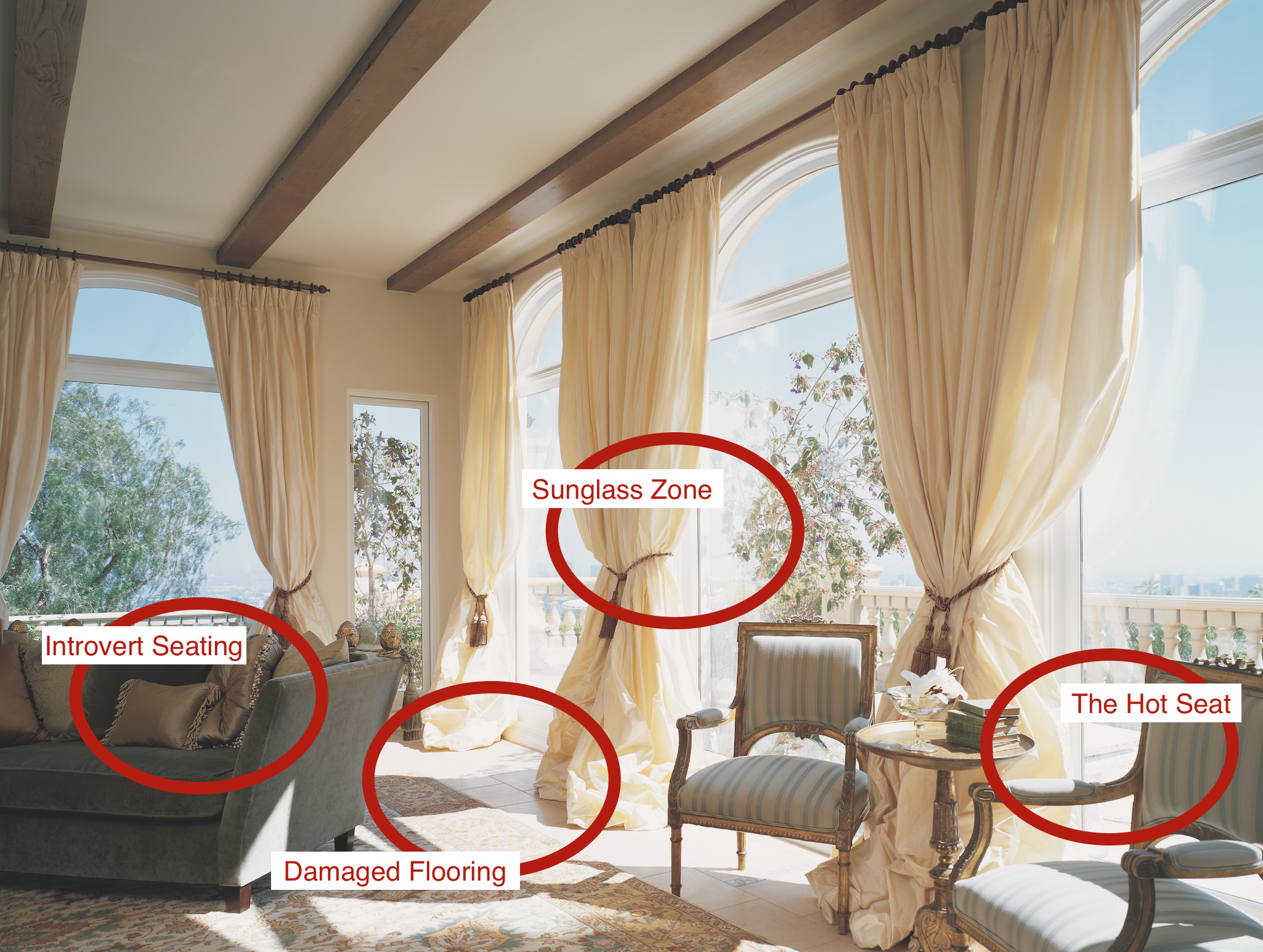 At first glance, this room looks incredible. The draperies add character, the decor coordinates beautifully, and the furniture is exquisite. Now, take a closer look…