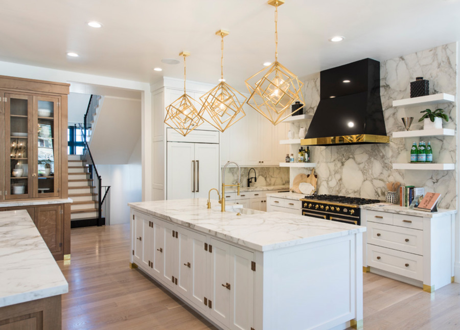 Lighting and gold are a match made in heaven! Statement pieces that sparkle, like these pendants over the island, exude personality into a space. They are truly defining elements. Just image this kitchen without them–or with some other form of lighting. The atmosphere and look would be completely different. If you have a space that just seems to need something, gold lighting could be your ticket to instant designer style.